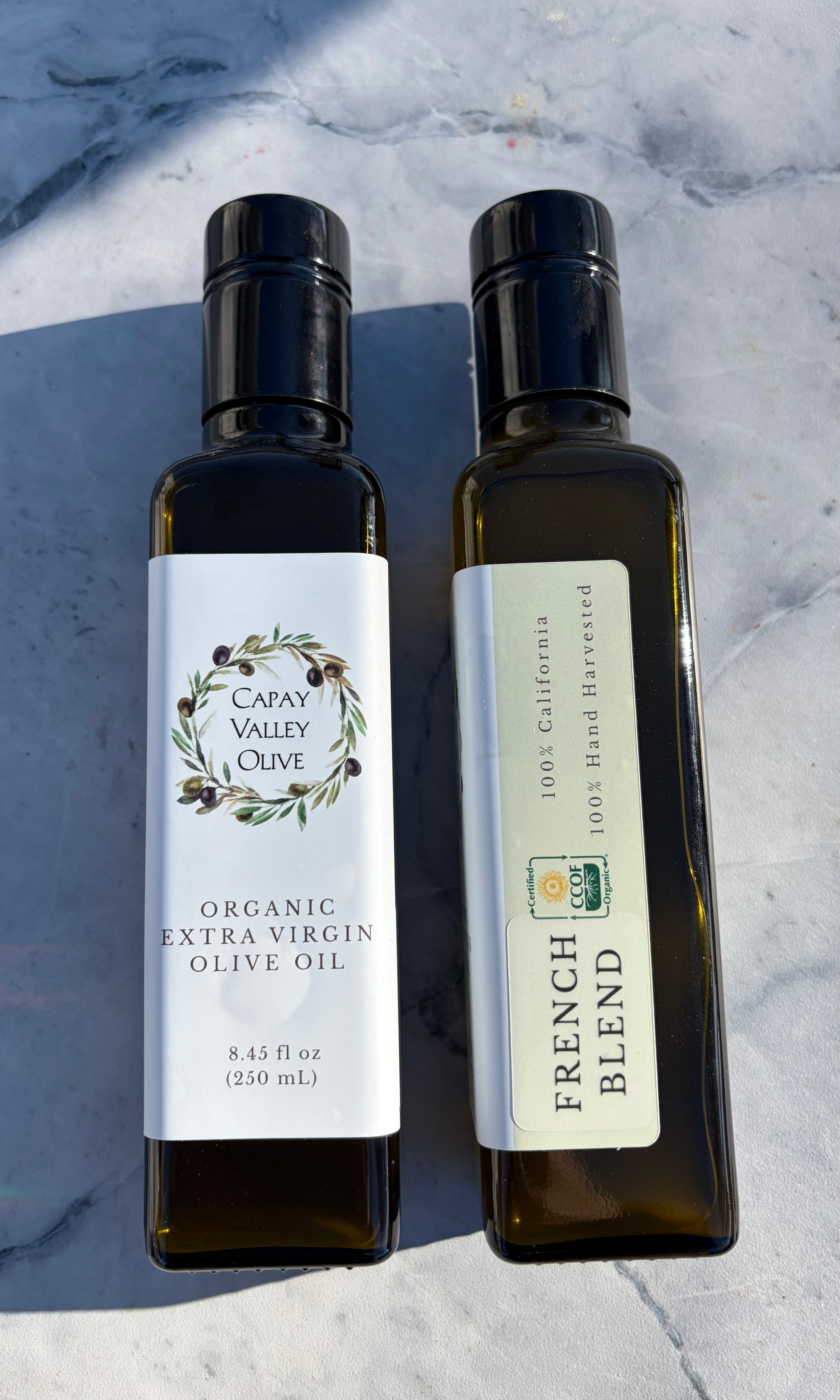 This French Blend combines equal parts Picholine and Aglandau, resulting in an olive oil with depth, balance, and understated complexity. The aroma opens with green olive and fresh herbs, followed by darker notes that add a subtle richness on the nose and palate.
